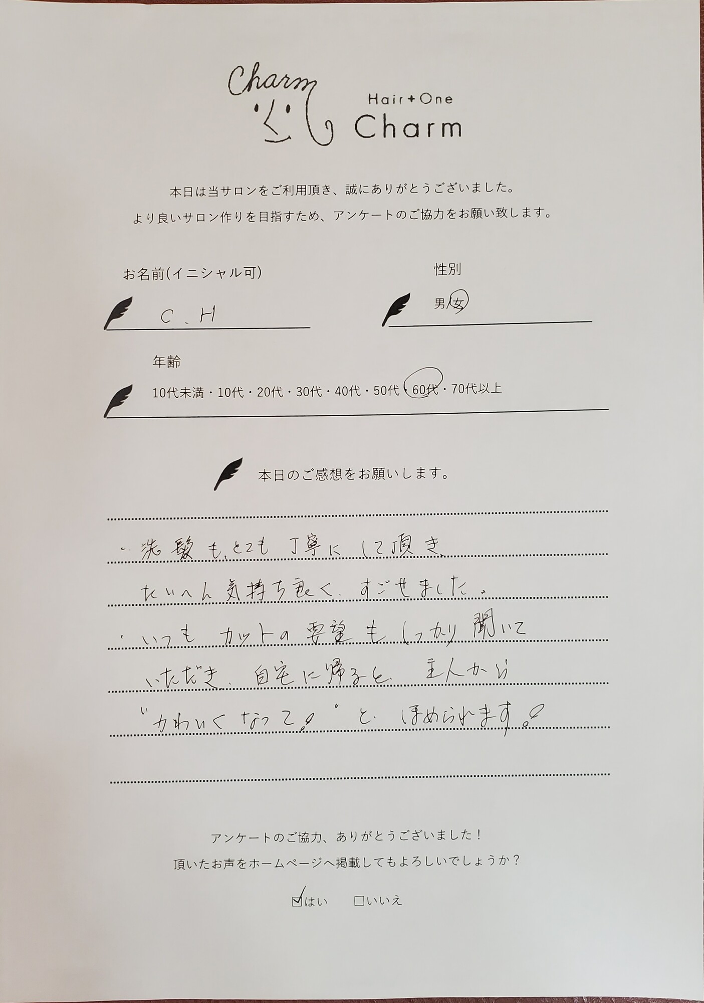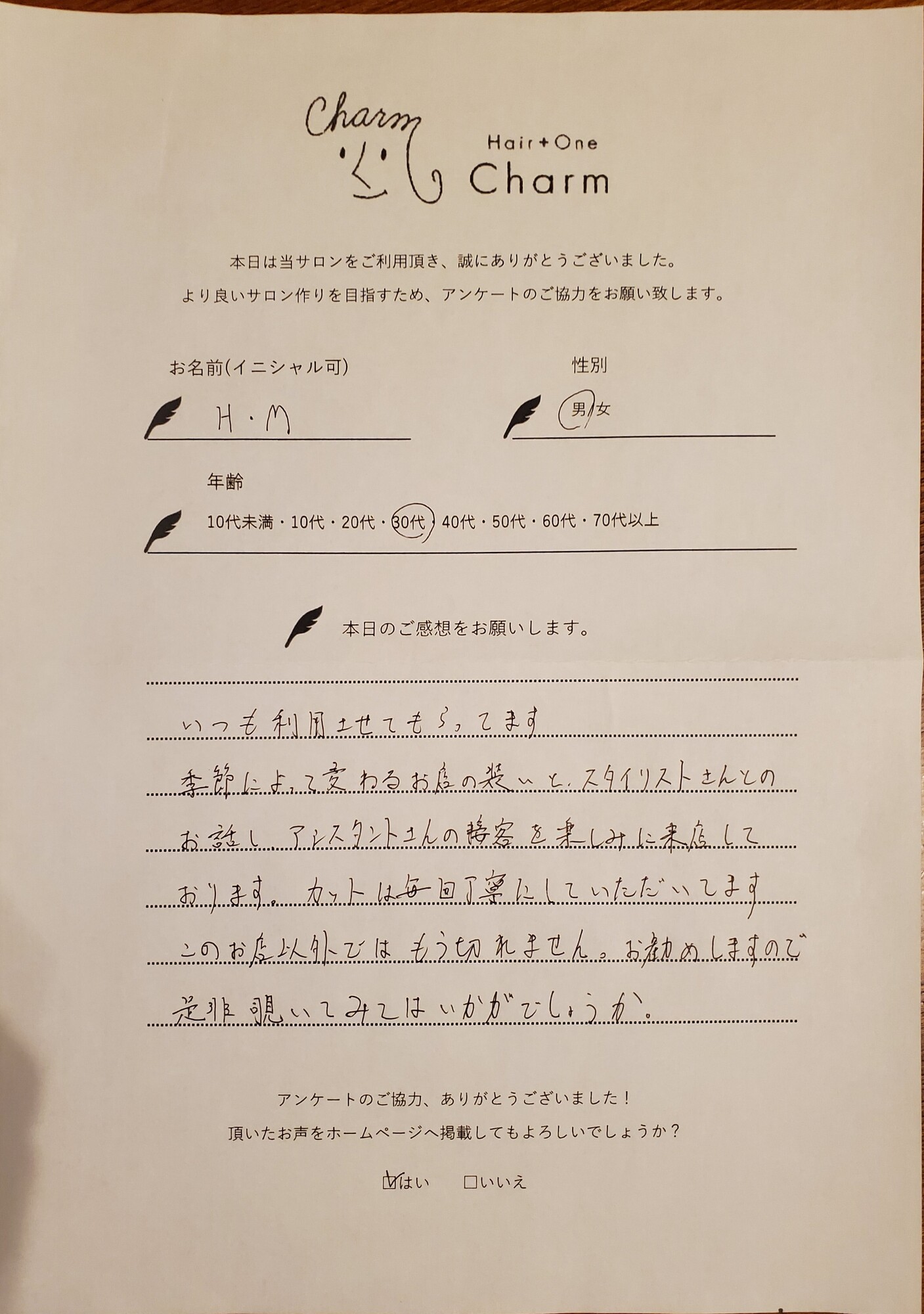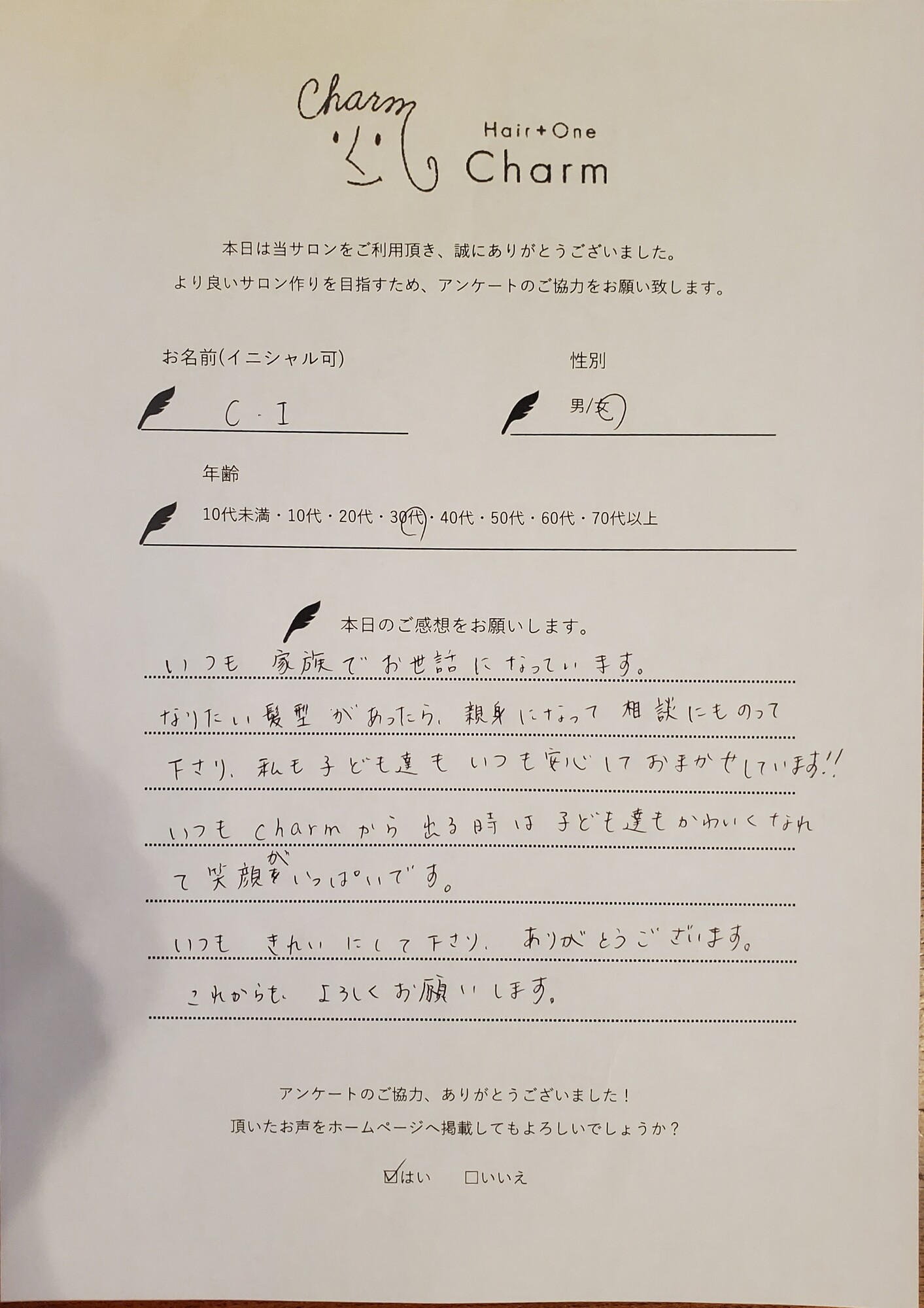 charmから帰るときは髪も気分もスッキリ出来るように、益々頑張りますので、今後ともよろしくお願いします。